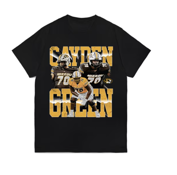Rep your favorite Tiger in style with this Cayden Green Mizzou Black T-Shirt. Featuring bold gold lettering and high-impact graphics of Cayden Green in action, this shirt is the perfect way to show your support for Mizzou football. Crafted from soft, breathable cotton, it’s built for comfort on game day and beyond.