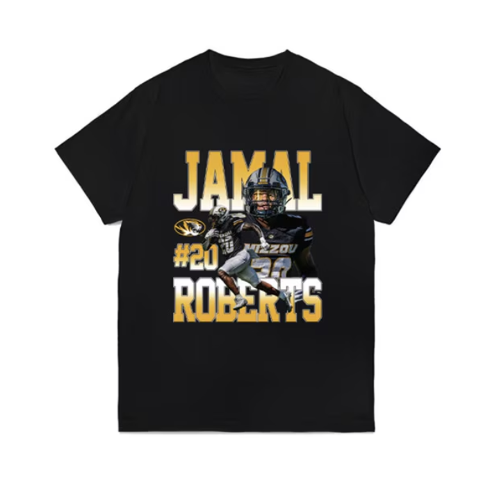 Show your support for one of Mizzou’s most dynamic players with this Jamal Roberts Mizzou Black T-Shirt. Featuring bold player artwork, #20 lettering, and the official Tigers logo, this shirt brings your Mizzou football pride front and center. Made with soft cotton fabric, it’s perfect for game days, tailgates, or casual wear.