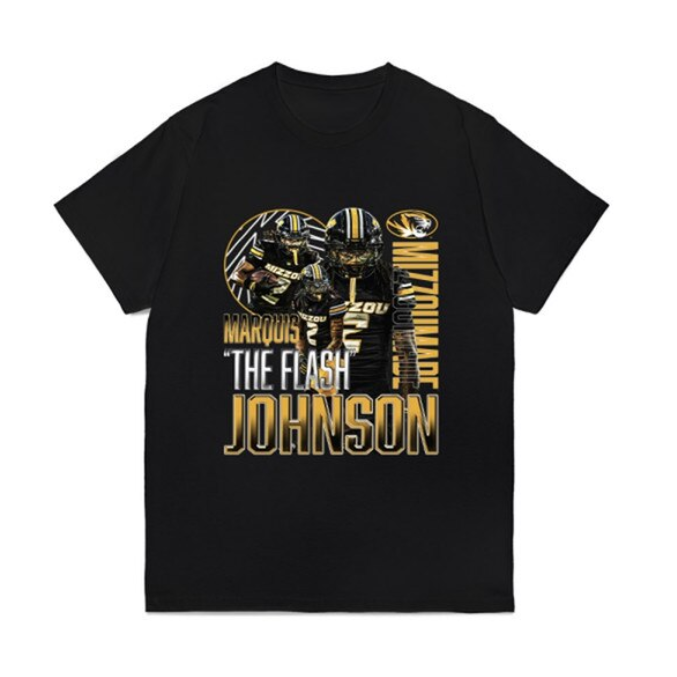 Speed meets style with this Marquis “The Flash” Johnson Mizzou Black T-Shirt. Featuring striking full-color graphics of Johnson in action and bold gold lettering, this tee celebrates one of Mizzou’s fastest playmakers. Whether you’re in the stands or on the move, this shirt lets your Tiger pride shine.