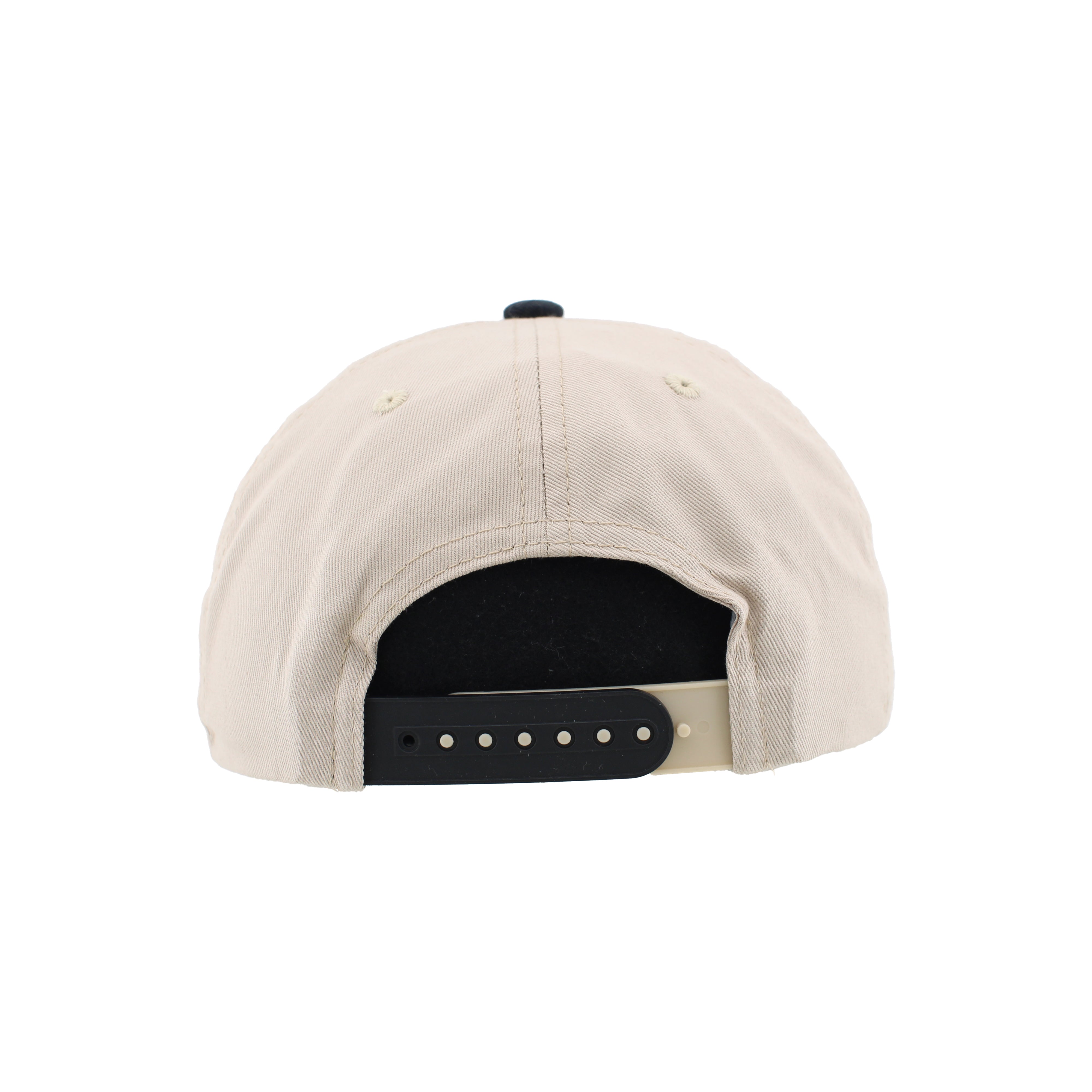 Two-tone design: Tan crown with contrast black bill and button detail.