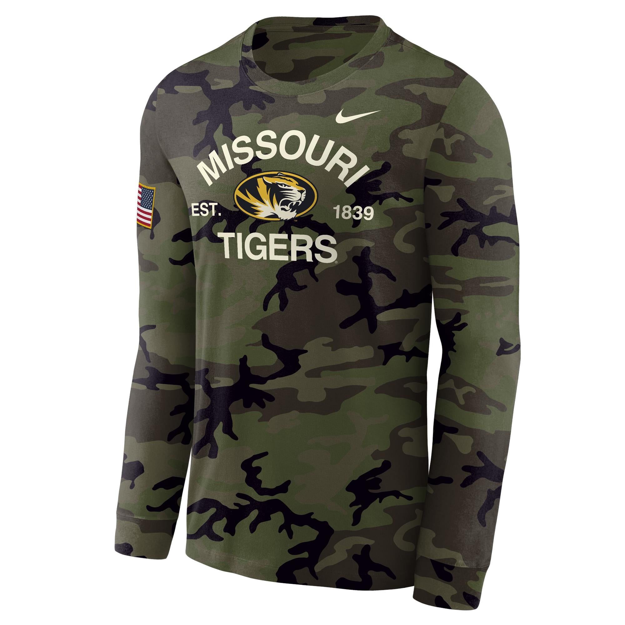 Mizzou Tigers Nike® 2025 Military Appreciation Legend Oval Tiger Head Flag Sleeve Camo Long Sleeve T-Shirt